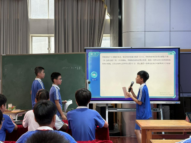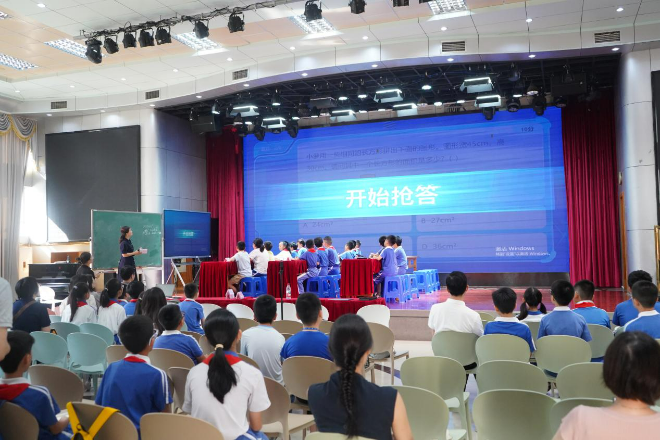 六年级“数学思维”挑战团体赛采用三人组队形式。比赛先分小组进行小组挑战,小组积分高的前3名进入终极挑战;每组挑战先进行必答环节,再进行抢答环节。学生需要运用所学数学知识解决现实生活中的开放性、综合性和探究性问题,抢答环节还须向观众详细讲解思考过程。这个项目对学生的数学核心素养、团队合作意识和表达能力提出了较高要求,有利于引导数学拔尖创新人才的特长发展。