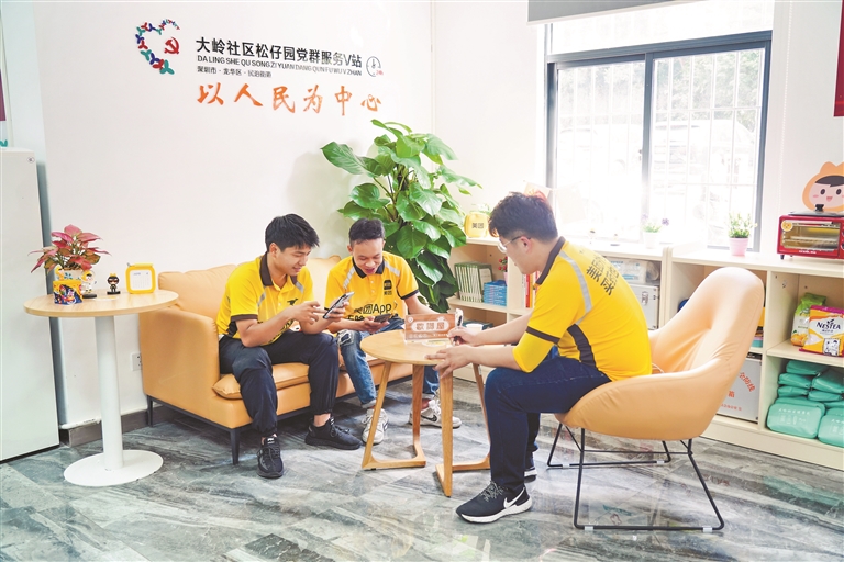骑手在大岭社区松仔园党群服务V站休息。