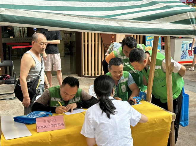 此外,针对新就业形态劳动者,金融顾问专门定制并介绍了意外伤害保险方案,清晰讲解了投保条件、理赔流程及报销须知等具体事项,切实保障骑手等群体的职业安全与权益,进一步提升其获得感与安全感。赤尾社区健康服务中心的医生在“暖心社康服务”摊位为往来骑手、快递小哥等新就业群体提供免费血压测量服务,并详细介绍签约家庭医生的便利与优势,现场指导办理签约流程,让更多灵活就业者享受到便捷、专业的基层医疗服务。