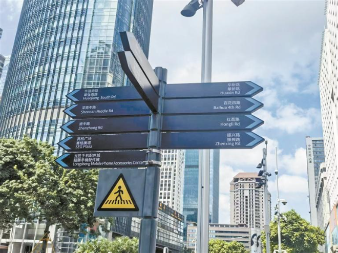 近日,细心的市民发现,多语种指路牌出现在华强北步行街街头。记者现场看到,区别于目前广泛使用的蓝底白字指路牌,这种灰色的牌杆挂着多个长方形牌子,路牌上各单位名、路名的汉字下方,还标有繁体字和英文,一目了然。