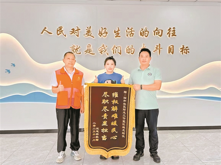 “多亏你们一次又一次的耐心调解,不然这事儿真不知道要拖到什么时候!”去年,龙光玖誉府的梁女士将一面鲜红的锦旗,送到福城街道四和社区的“阿龙网格工作室”。原来,梁女士卖房时房屋漏水且有白蚁,因维修费和范围产生争议。龙华区综治中心收到纠纷诉求后,统筹三级平安建设资源力量,发动社会组织参与,组织双方及物业现场调解,一场历时数月的房屋纠纷圆满化解。