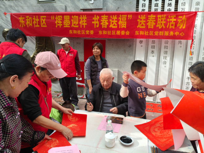春节临近,年味渐浓。2月5日下午,东和社区组织开展“挥墨迎祥 书春送福”新春送春联活动。现场挥毫泼墨,将满载吉祥与温情的新春对联送到居民手中,提前传递新春关怀与美好祝福。