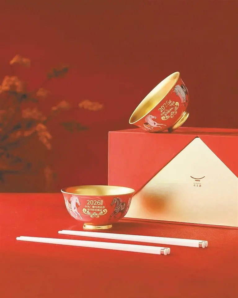 这次亮相春晚的核心产品有典藏款马到成功金春碗。这是总台文创历史上首次发行的金碗类产品,堪称现象级升级。它采用了国瓷永丰源独有的多层次高精度芯片级浮雕叠印技术,让碗身的骏马图案肌理分明、极具动感,被誉为“中国人的金饭碗”,寓意捧金纳福,财满家圆。另外,还包括象征同心团圆的十二骏摆盘。以及平衡了传统茶道与现代生活的茶咖具等,将福、禄、寿、喜、财等多元吉祥文化融入现代生活。