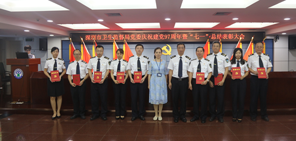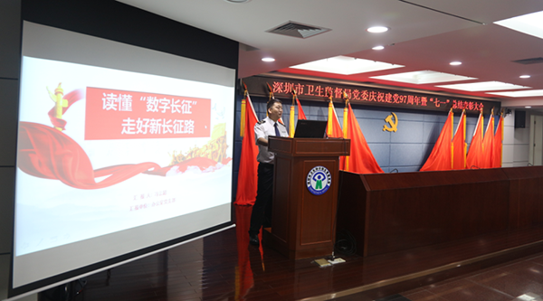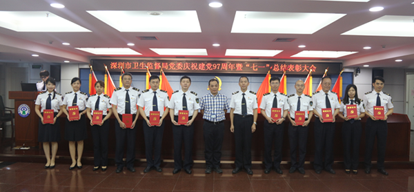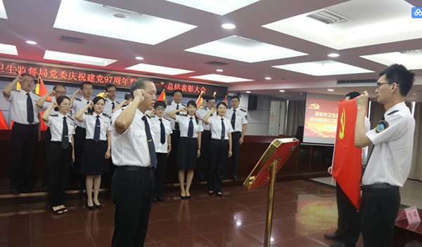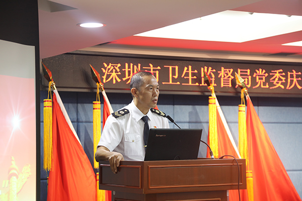 最后,局党委书记、局长蔡本辉同志作了讲话,回顾了中国共产党97年光辉历程,总结了局党委和广大党员干部职工团结拼搏、务实进取、担当奉献所取得的成绩,并对如何做好下一步工作提出两点意见,他指出,要全面贯彻落实习近平新时代中国特色社会主义思想和党的十九大精神,深入学习贯彻省委十二届四次全会、市委六届八次、九次全会以及全市卫生与健康大会精神,自觉对标最高最好最优,以“走在最前列、勇当尖兵”的姿态,落实全面从严治党主体责任,充分发挥党组织战斗堡垒作用;主动担当,充分发挥共产党员先锋模范作用,积极主动在新时代全市经济社会发展大局中谋划卫生监督事业发展,为加快打造健康中国“深圳样板”,努力全方位全周期保障市民健康作出应有贡献。