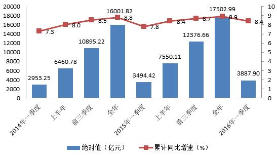 在外部经济环境复杂多变的形势下和全国经济持续下行的背景下,全市经济继续保持上年良好增长态势,开局稳进,初步核算并经广东省统计局核定,一季度全市生产总值3887.90亿元,按可比价格计算,同比增长8.4%,增速分别比2014年、2015年同期加快1.1个、0.6个百分点,高出2012-2015年四年同期平均增速0.9个百分点,也高于全国和全省增速1.7个和1.1百分点,实现“十三五”首年首季“开门红”(见图1)。其中,第一产业增加值1.10亿元,下降35.2%;第二产业增加值1557.21亿元,增长7.5%;第三产业增加值2329.59亿元,增长9.1%。