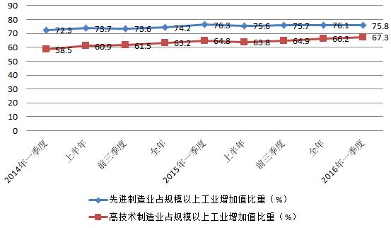 图2 2014-2016年一季度深圳先进制造业和高技术制造业占规模以上工业增加值比重走势图