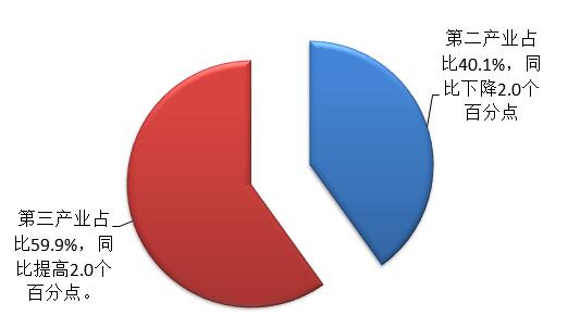 第三产业比重继续上升,现代服务业较快发展。二三产业结构由上年同期的42.1:57.9调整为今年一季度的40.1:59.9,服务业占比提高了2.0个百分点(如图3)。现代服务业较快发展,其中金融业增加值606.92亿元,增长10.9%,占GDP比重15.6%,同比提高0.2个百分点;房地产业增加值351.81亿元,增长12.6%,占GDP比重9.0%,同比提高2.0个百分点;其他服务业(主要是信息传输、软件和信息服务业,租赁和商务服务业,科学研究和技术服务业,水利、环境和公共设施管理业,居民服务、修理和其他服务业,教育,卫生和社会工作,文化、体育和娱乐业,公共管理、社会保障和社会组织等现代服务业)增加值751.80亿元,增长10.8%,占GDP比重19.3%,同比提高0.8个百分点。