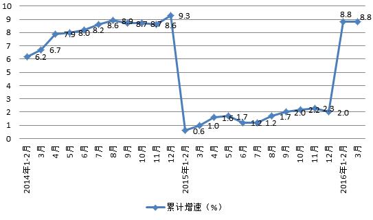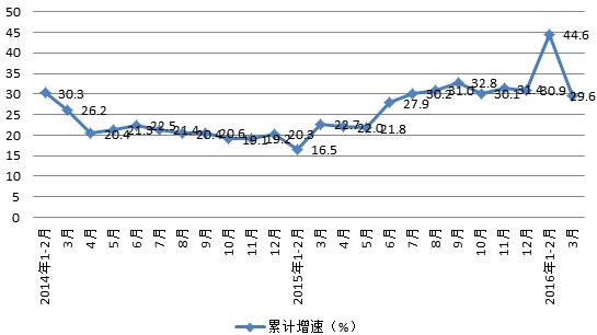 图4 2014-2016年一季度深圳固定资产投资各月累计同比增速走势图