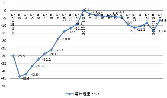 图6 2014-2016年一季度深圳进出口总额各月累计同比增速走势图