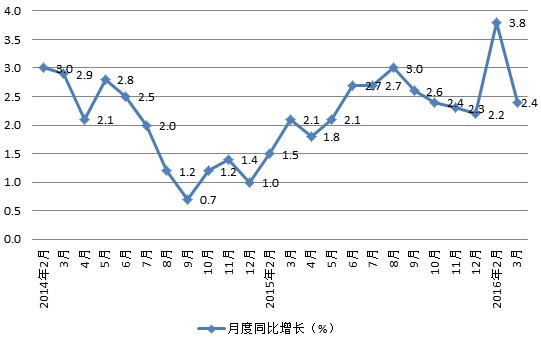 图8 2014-2016年3月深圳居民消费价格上涨情况(月度同比)