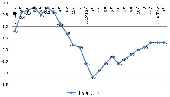 图9 2014-2016年3月深圳工业生产者出厂价格涨跌情况(月度同比)