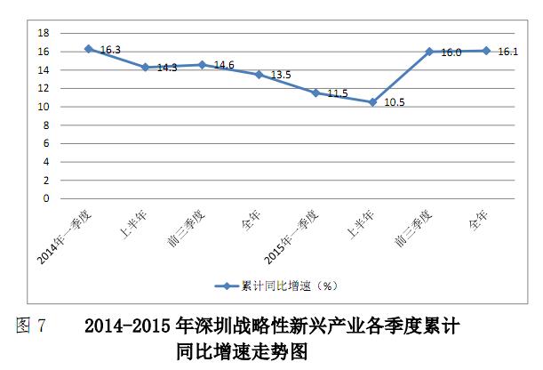 初步核算并经广东省统计局核定,2015年全市生产总值达17502.99亿元,按可比价格计算,比上年(下同)增长8.9%,增幅分别比全国和全省高2.0和0.9个百分点。分季度累计增幅看,一季度增长7.8%,上半年增长8.4%,前三季度增长8.7%,全年增长8.9%,增速逐季提高。分产业看,第一产业增加值5.66亿元,下降1.7%;第二产业增加值7205.53亿元,增长7.3%;第三产业增加值10291.80亿元,增长10.2%。分区域看,龙岗区生产总值2636.79亿元,增长10.5%;光明新区670.66亿元,增长9.4%;坪山新区458.07亿元,增长9.4%;南山区3714.57亿元,增长9.3%;福田区3256.24亿元,增长9.0%;宝安区2640.92亿元,增长9.0%;盐田区487.23亿元,增长8.9%;罗湖区1728.39亿元,增长8.0%;龙华新区1635.59亿元,增长8.0%;大鹏新区274.53亿元,增长4.0%。
