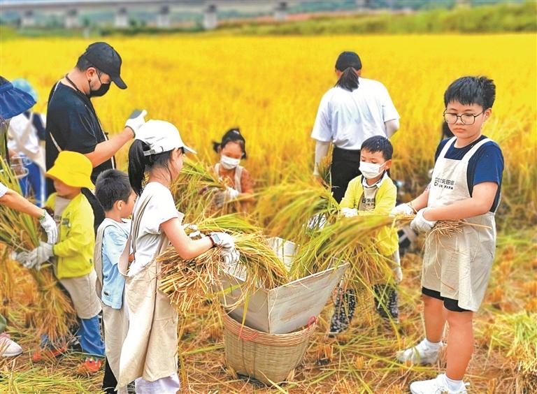 暑假期间,深圳光明欢乐田园推出“欢乐小农夫·丰收夏令营”和“欢乐小农夫·插秧夏令营”劳动教育实践活动,让城里娃体验下田插秧、收割水稻、打稻谷等实践型农耕劳作过程,受到很多家长和小孩的欢迎。