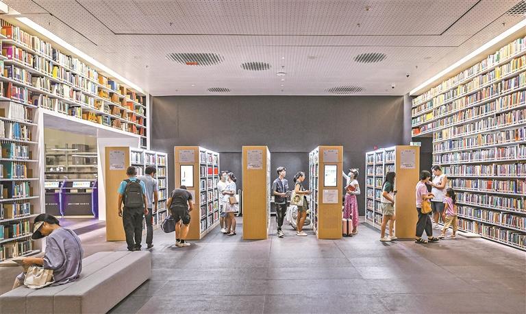 日前开放试运行的深圳图书馆北馆科技感、便利性、舒适度特征明显。图为众多市民在馆内取阅书籍。