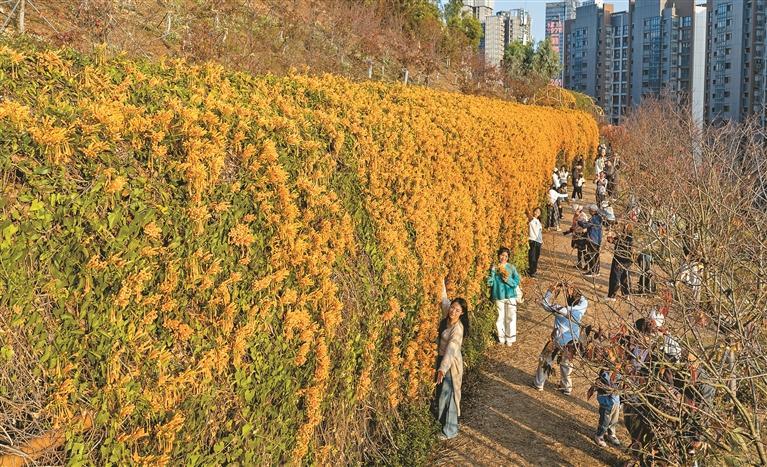 南山区华英路景观公园百米花廊迎来盛景。千万朵炮仗花如瀑倾泻,宛若春日为城市编织的流苏绶带。
