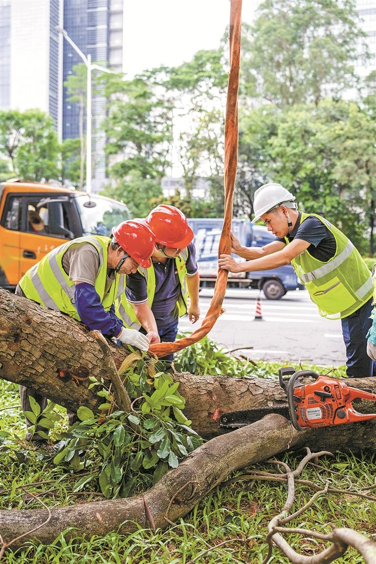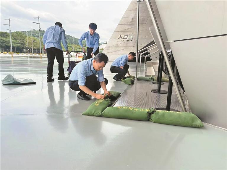 昨日,深圳当代艺术与城市规划馆工作人员在出入口等关键处摆放防汛沙袋。