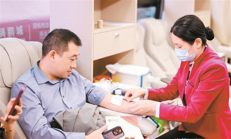 水贝珠宝园区举行无偿献血十周年活动。图为市民在献血。
