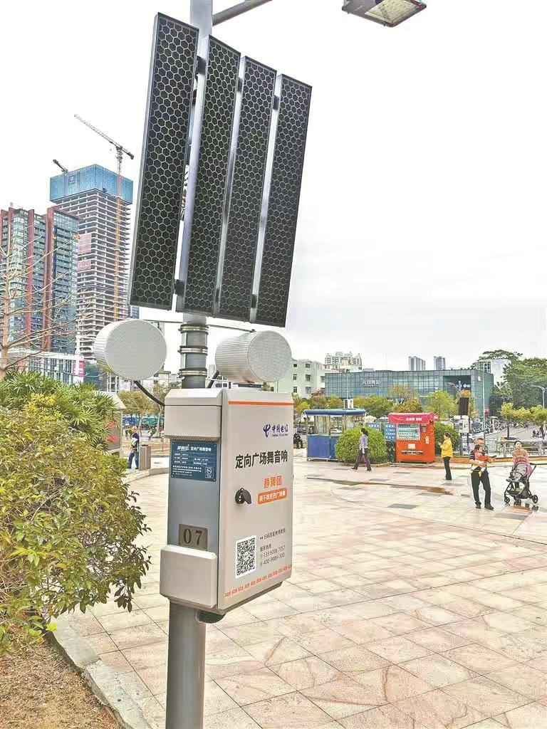同时,南山区城管局将目光投向了技术解决方案,推动噪声管控从“人防”向“技防”智慧升级。在中山公园东门广场,三台新型定向音柱设备悄然投入使用。与普通音响声音向四周均匀扩散不同,定向音柱采用了先进的声波定向传播技术。它能够像手电筒聚光一样,将声音能量集中投射在特定方向角度内,形成清晰的“声音覆盖区”。当广场舞团队在指定区域活动时,只有站在这个“声音光束”范围内的参与者能清晰听到音乐,一旦走出这个区域,音量便会急剧衰减。这种“精准投送”改变了声音的传播模式,实现了“噪声不出圈”。