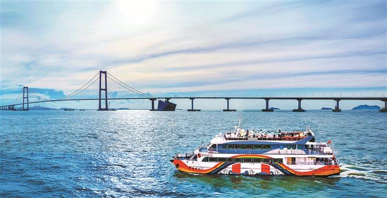 2026年伊始,广东全面启动“广货行天下”春季行动,“线上+线下”深度协同,“广货+文旅”高度融合。“请到广东过大年”文旅消费惠民活动正在举行之际,深圳航运集团旗下“海上彩虹号”观光船获深圳市旅游协会授予“深圳最具特色旅游点”称号,成为“广货+文旅”融合的重要载体。图为“海上彩虹号”行经深中通道附近水域。