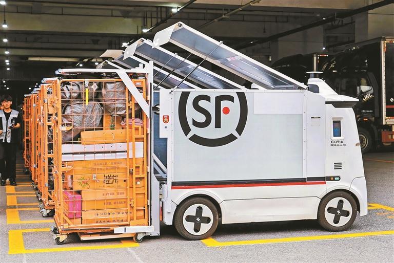 深圳在“无人机+无人集卡+无人小车”的物流配送场景上形成创新示范。图为龙华顺丰转运站内的无人车。