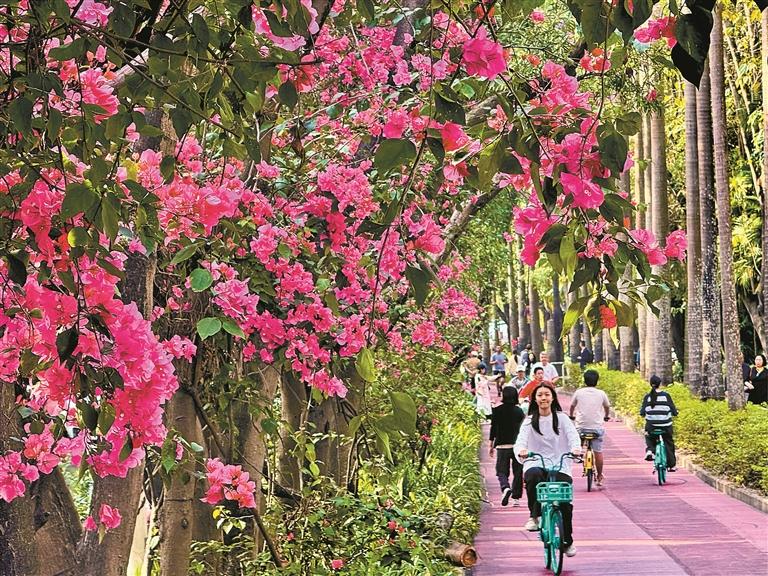 近日,华侨城香山中街两侧栽种的簕杜鹃进入花期,成为市民打卡热点。