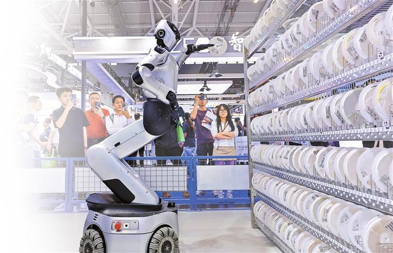 图为在深圳乐聚机器人展区,夸父5-W轮式人形机器人,以真实工厂作业场景为蓝本,动态演示上下料、柔性搬运等核心工业任务。