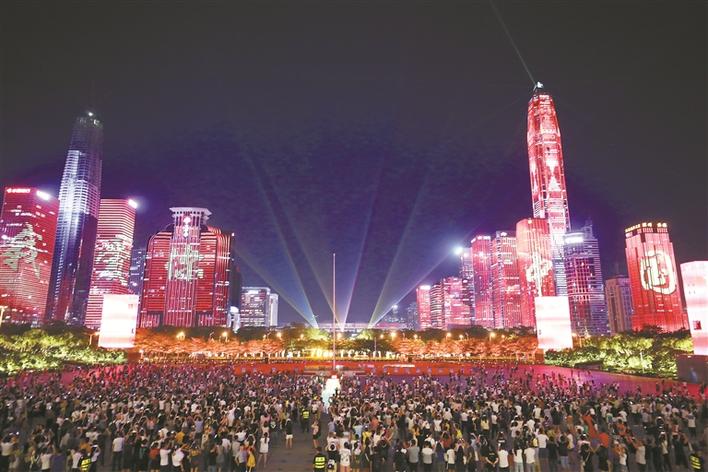 “我和我的祖国”特别版灯光秀20日晚在福田中心区首演,由国庆开场画面、我爱你中国、辉煌新时代、我和我的祖国、先行示范区等部分组成,为市民和游客打造流光溢彩、美轮美奂的视觉盛宴,共庆中华人民共和国成立70周年。据悉,“国庆特别版”灯光秀将持续到10月15日。