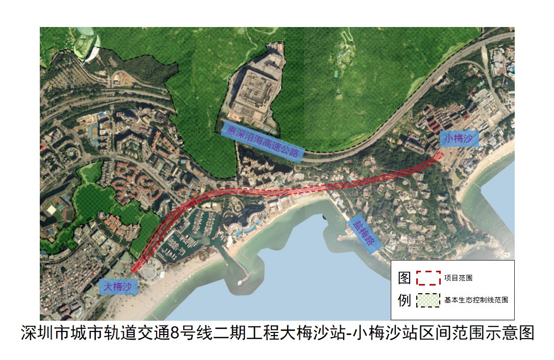 深圳市地铁集团有限公司申请办理深圳市城市轨道交通8号线二期工程大梅沙站-小梅沙站区间的建设项目用地预审与选址意见书。申请范围位于盐田区梅沙街道,全部为地下空间,用地面积约50059.04平方米,土地用途为轨道交通用地。经核查,该项目约有1204.00平方米位于基本生态控制线范围内。