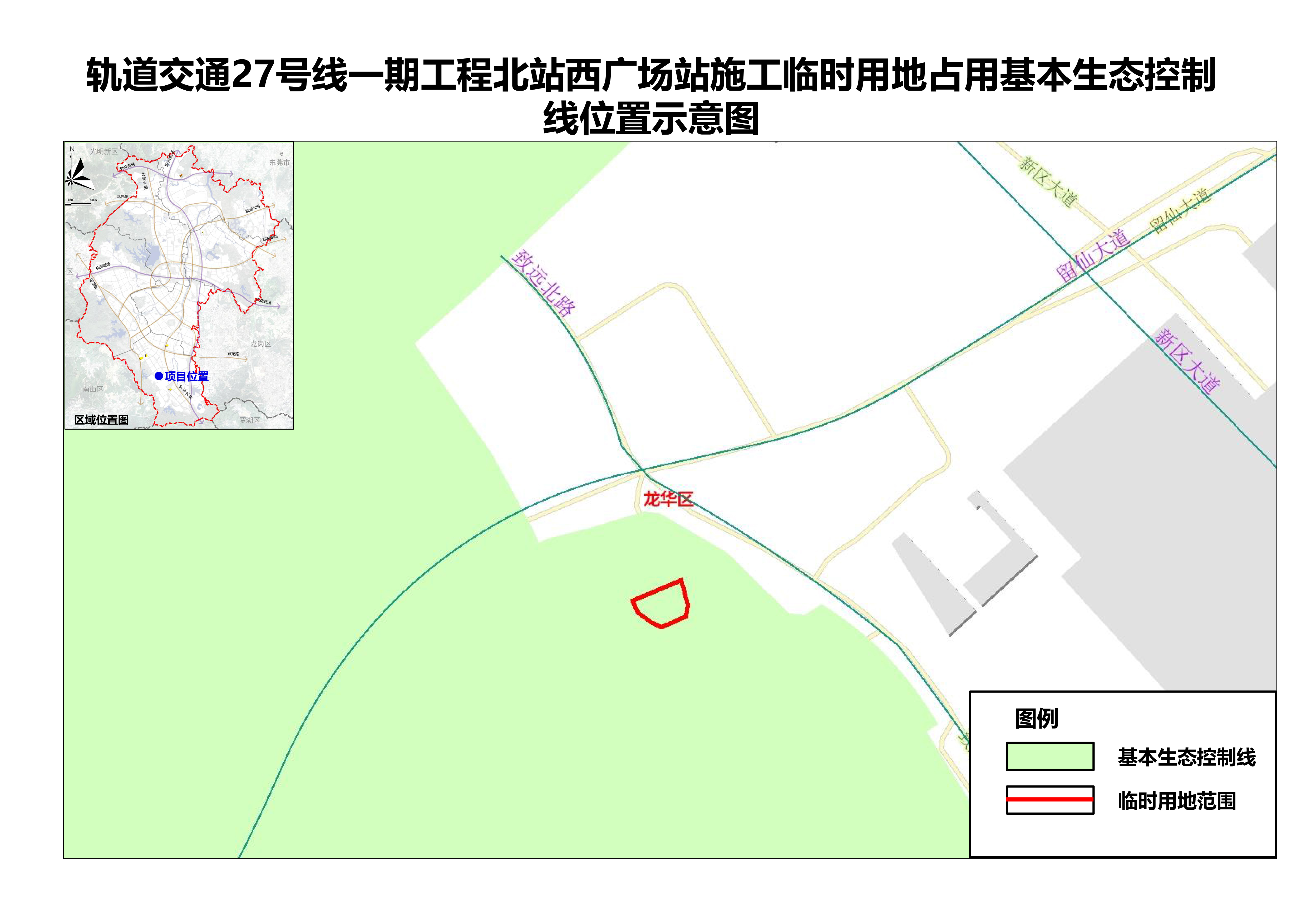 深圳市交通运输局、深圳市地铁集团有限公司申请办理轨道交通27号线一期工程北站西广场站施工临时用地审批手续。该临时用地位于龙华区民治街道深圳北站留仙大道与致远中路西南,拟作为临时生活用房,用地面积1675.79平方米,建筑面积1050平方米,使用期限4年,全部位于基本生态控制线范围内。
