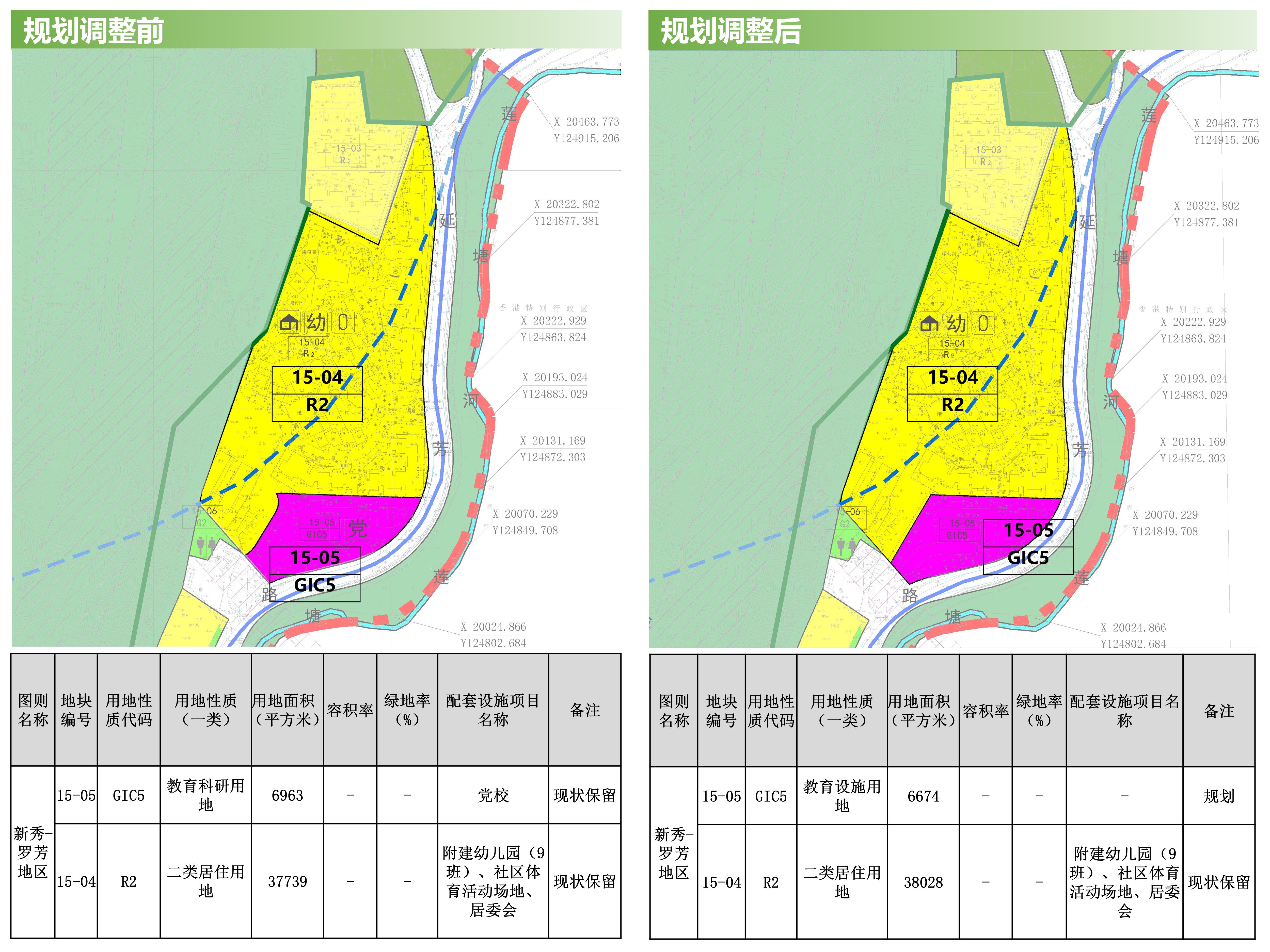 15-04地块用地面积调整为38028平方米,其余不变;15-05地块用地面积调整为6674平方米,用地性质调整为教育设施用地(GIC5),配套设施调整为“—”,备注调整为规划。