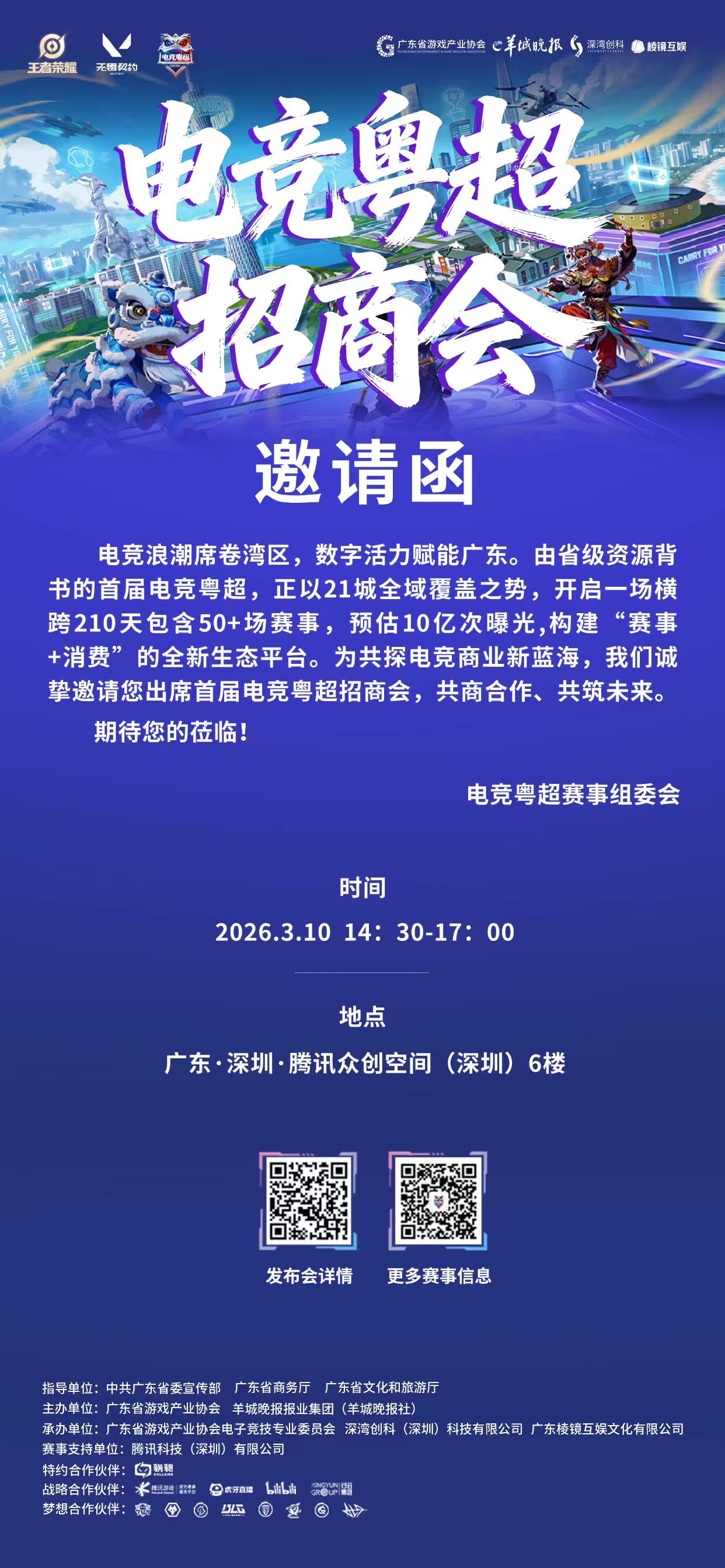 广东省首届电子竞技超级联赛(以下简称“电竞粤超”)已全面启动。该项目由中共广东省委宣传部、广东省商务厅、广东省文化和旅游厅联合指导,已被列为2026年广东省十大全民活动之一。