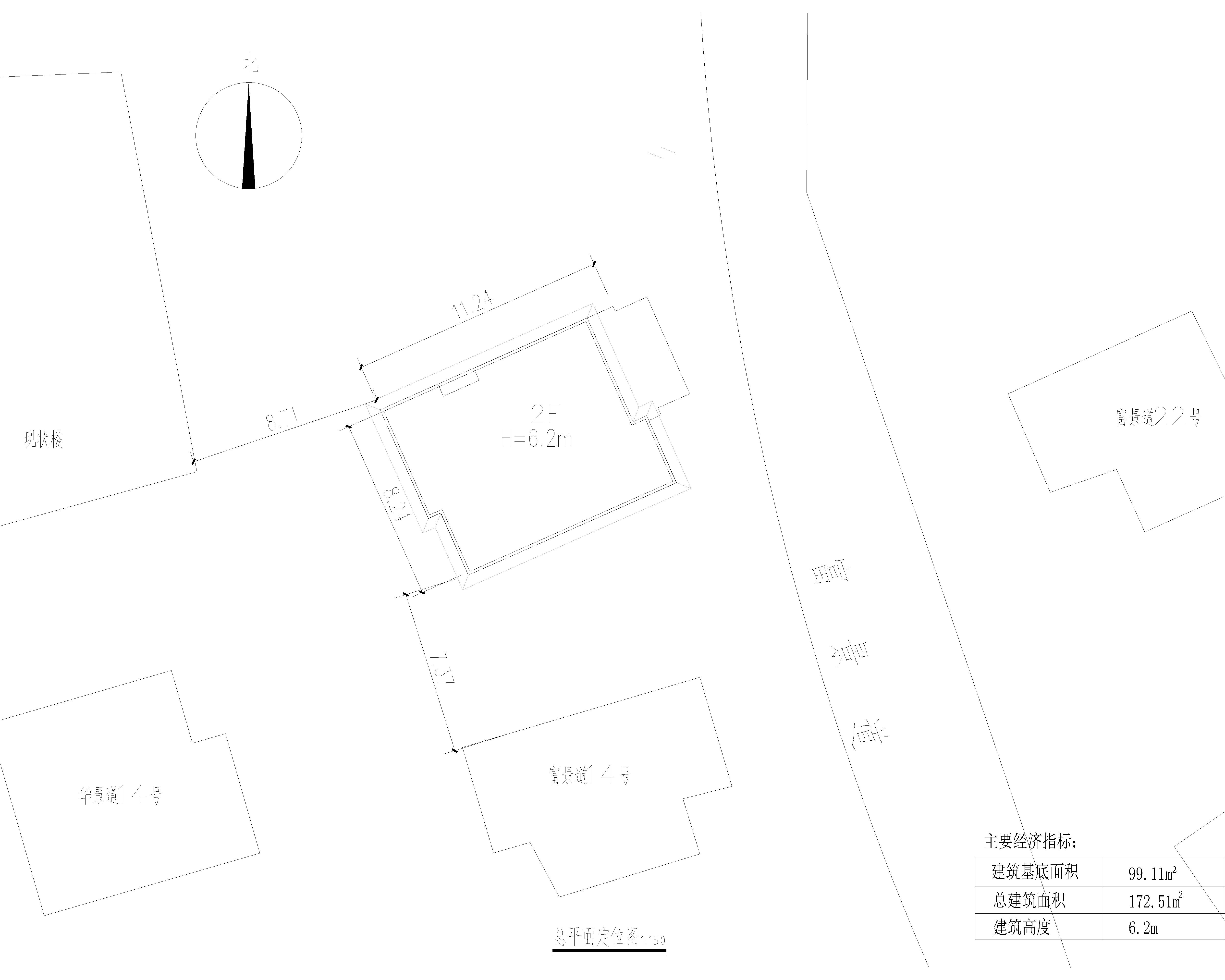 总建筑面积172.51平方米,建筑层数2层,建筑高度6.2米,建筑基底面积99.11平方米,重建建筑功能为原功能不变。