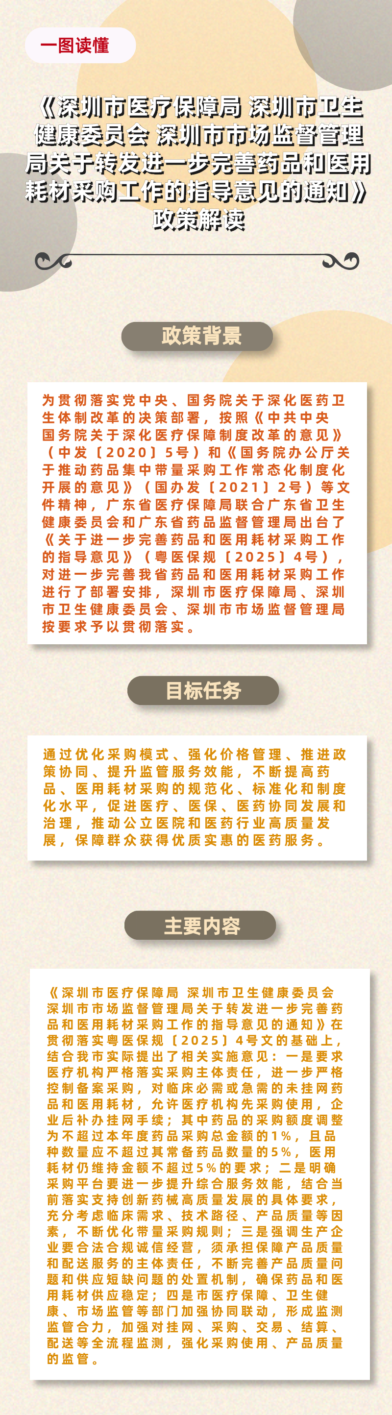 名 称:《深圳市医疗保障局 深圳市卫生健康委员会 深圳市市场监督管理局关于转发进一步完善药品和医用耗材采购工作的指导意见的通知》政策解读