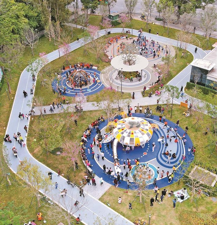 上步绿廊公园带为地铁复绿项目,以“生态优先,低碳示范”为原则,关注适老性设计和儿童友好设计,共释放约20000平方米活动空间,以“一园一特色”思路打造5个不同主题的公园,从多个维度探索构建全龄友好的城市公共空间。图为充满童趣的“星空园”吸引了许多小朋友。