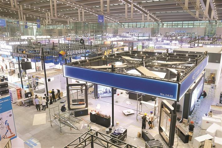 昨日,深圳会展中心1号馆,工作人员正在布展。