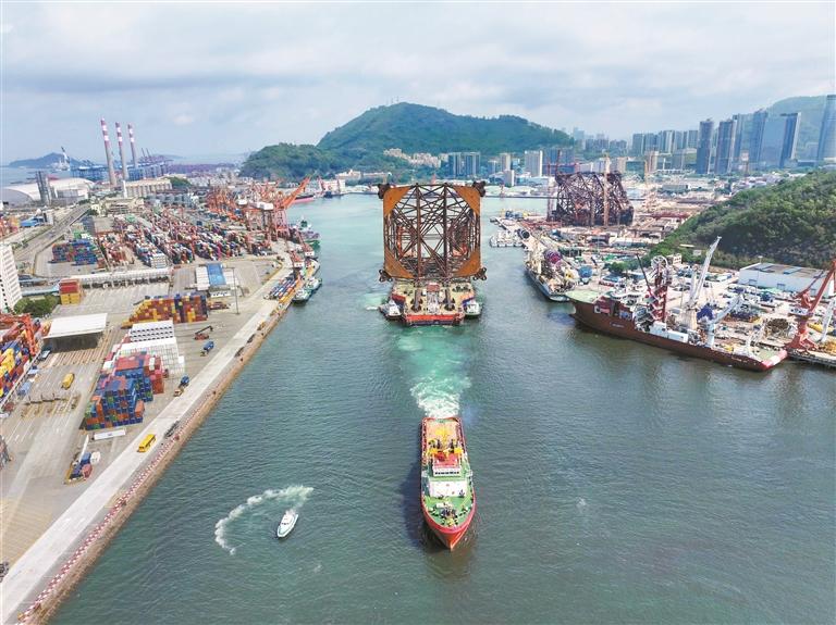 4月16日上午11时,在深圳南山海事局海巡艇的护航下,亚洲最大水下驳船“海洋石油229”运载超1.4万吨重的惠州26-6平台导管架从深圳赤湾建造场地顺利驶向安装及作业所在南海东部海域。