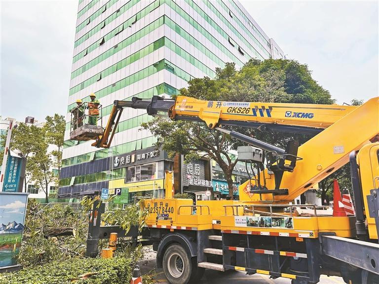 南山区城管人员修剪树木,防止树枝坠落砸到行人和车辆。