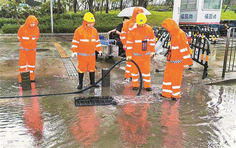 宝安区三防指挥部启动防汛四级应急响应后,迅速开展各项防御工作,及时准确向本辖区、本系统及行业管理对象发布预警信息,加强值班值守,积极做好暴雨防御工作。在航城街道洲石路转107国道、兴桥街道上星南路与中心路交会路段等重点防涝路段,宝安排水公司的工作人员冒着暴雨,及时清理树叶畅通排水通道,打开雨水箅加快排水,架设护栏设置安全区处理雨水冒溢,确保市民行车行路安全。
