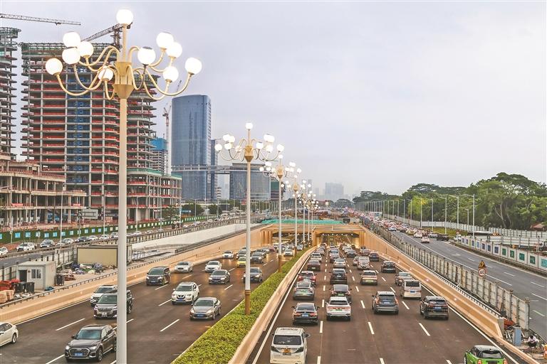 滨海大道(总部基地段)交通综合改造工程项目西起沙河东路立交,东至广深高速,跨南山、福田两区,全长5950米。其中,总部基地段全线下沉,下沉隧道段长度为1560米,其余地面改造段长度为4390米。此次下沉隧道主线开通后,可有效提升滨海大道通行效率,改善深圳湾超级总部基地交通配套。滨海大道(总部基地段)交通综合改造工程剩余的辅道建设将于今年下半年陆续完工,届时将形成主道双向8车道和辅道双向6车道的整体规模。