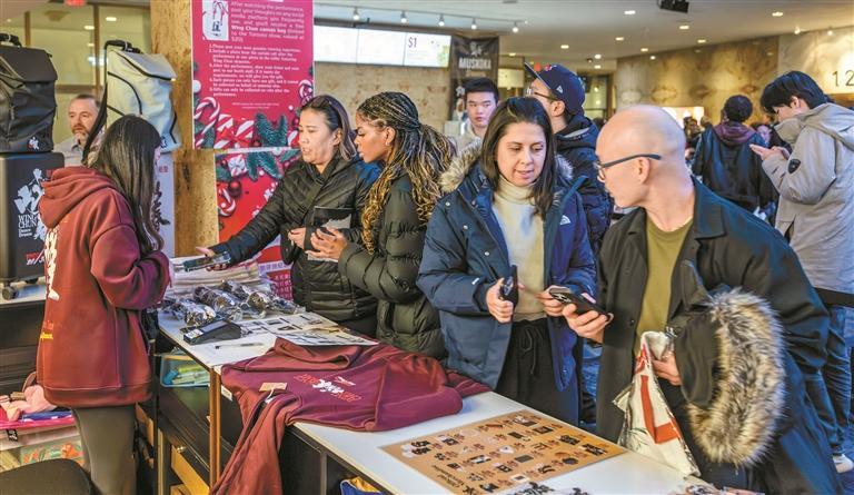 当地时间12月18日晚,在加拿大多伦多子午线大厅,观看深圳原创舞剧《咏春》演出的当地观众被制作精美的《咏春》文创产品吸引,纷纷前来选购。