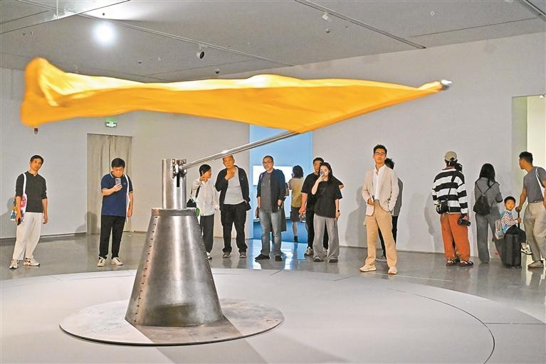 展厅内,一件动态艺术装置吸引观众驻足观看。