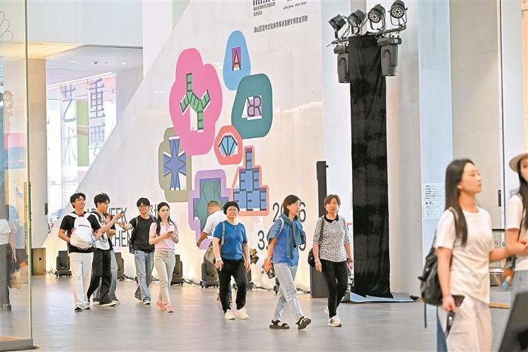 深圳艺术周展览现场,展馆入口处主题装置醒目亮眼,往来观众络绎不绝,现场人流涌动,尽显浓厚的艺术氛围。