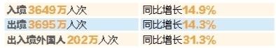 据深圳边检总站统计,今年一季度经深圳各口岸出入境人员7344万人次,同比增长14.6%,其中入境3649万人次、出境3695万人次,分别同比增长14.9%、14.3%。