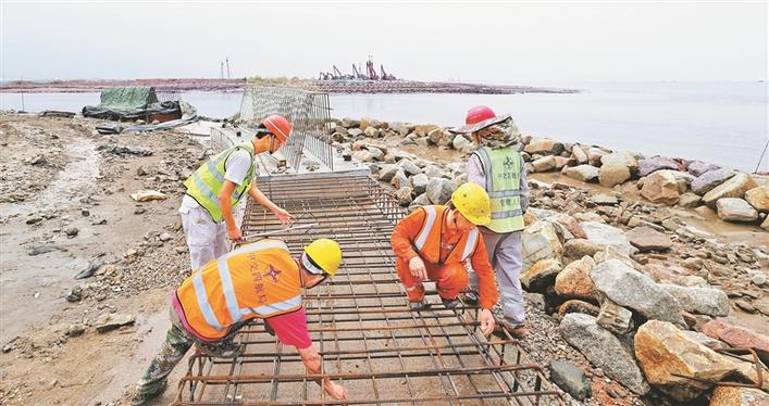 在新纳入前海合作区的四大片区中,29.36平方公里的会展新城及海洋新城片区犹如深圳西部海岸线上的明珠,未来这里将打造成全球海洋中心城市先锋范例。记者近日在深圳国际会展中心附近的建设工地采访时看到,广阔的工程场地内,桩机林立,工程车辆出出进进,“全副武装”的工人们正埋头忙碌。据了解,海洋新城目前正在进行土地整理,将加快启动区规划建设,预计3-5年初具雏形。图为工人进行海堤挡浪墙的模板安装。