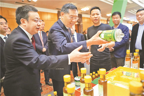Li Jianqin (2nd L), Guang’an’s Party chief, introduces Guang’an’s local specialty agricultural products at Thursday’s ceremony. Sun Yuchen