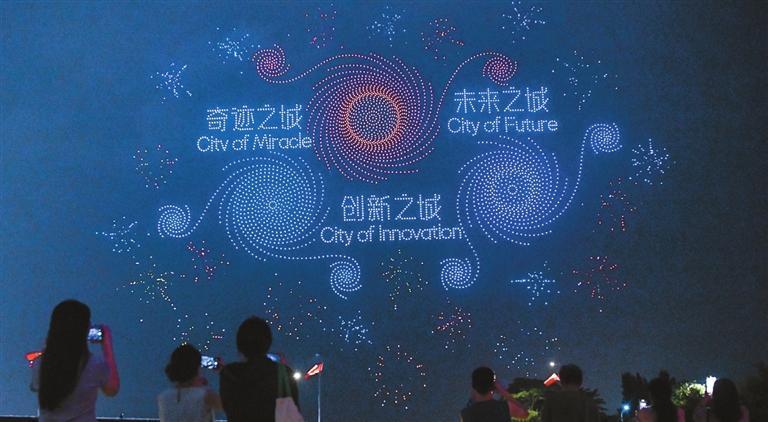 Residents and tourists watch a performance by 10,197 Damoda drones at Shenzhen Bay Park on Sept. 26, 2024.