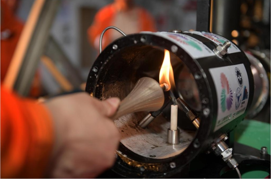Chen said scientific researchers aboard a research vessel located cold seep vents and remotely operated a device to collect gas hydrates from the seabed. Through pressure reduction, the hydrates released gas, which was dried and sent to a combustion chamber specially designed for the collection of the primordial flame.
