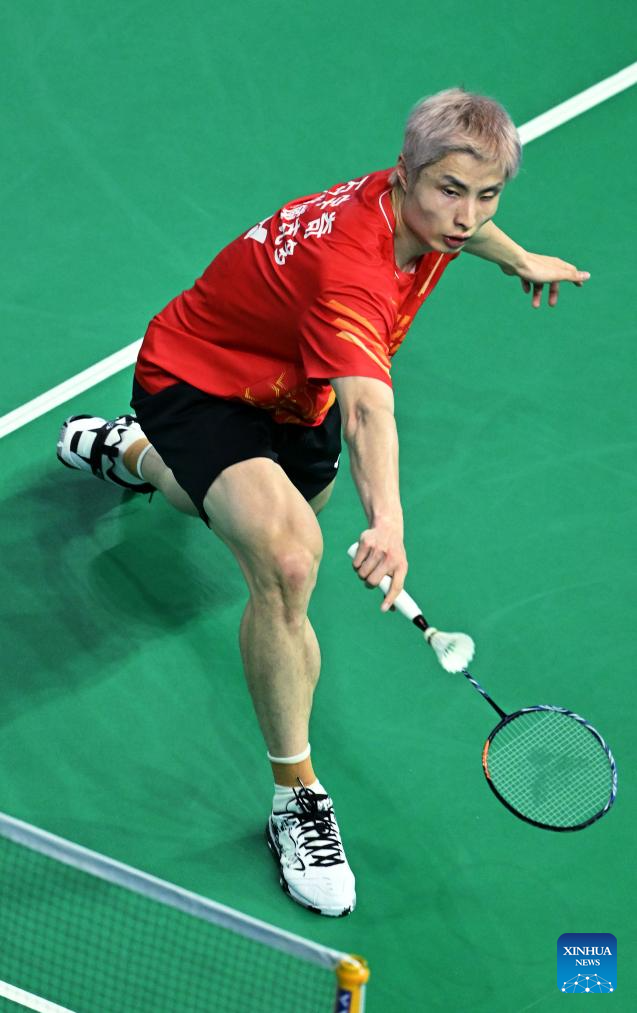 Shi Yuqi of Jiangsu hits a return to Zhu Xuanchen of Hubei during the men's team group match of badminton at China's 15th National Games in Shenzhen, south China's Guangdong Province, Nov. 9, 2025.