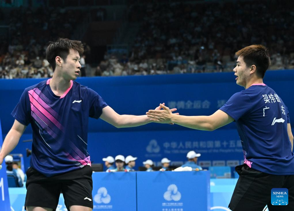 Liang Weikeng (R)/Ren Xiangyu of Guangdong celebrate scoring in the match against He Jiting/Lin Xiangyi of Fujian during the men's team group match of badminton at China's 15th National Games in Shenzhen, south China's Guangdong Province, Nov. 9, 2025.