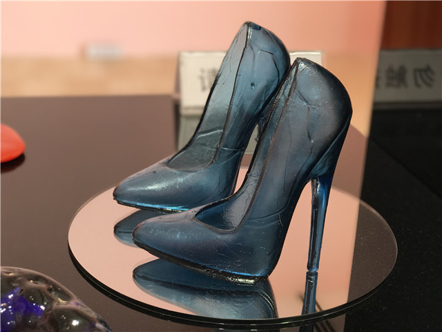A pair of glass stiletto heel shoes, part of the "Objects and Artifacts" installation designed by ?sa Jungnelius. (Photo by Cao Zhen)